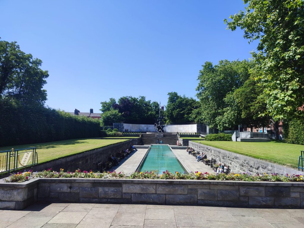 The park is small, but it’s well designed. A pathway leads through the center of the garden, around the cross shaped pool, guiding you toward its most striking feature—the Children of Lir sculpture by Oisín Kelly. This statue, based on an old Irish legend, shows human figures turning into swans. It symbolizes the enduring spirit of the Irish people and the idea of rebirth after suffering. The statue is both dramatic and graceful, adding emotional depth to the entire space. The long reflecting pool, lined with colorful mosaic tiles that show celtic symbols representing the end of the war, improves the calm and contemplative atmosphere. The surrounding trees and small lawns enhance the sense of peace and tranquility.